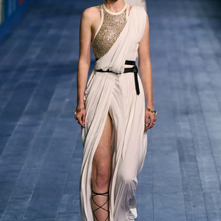 Drapeados e vestidos plissados, sandálias gladiadoras, franjas e transparencias